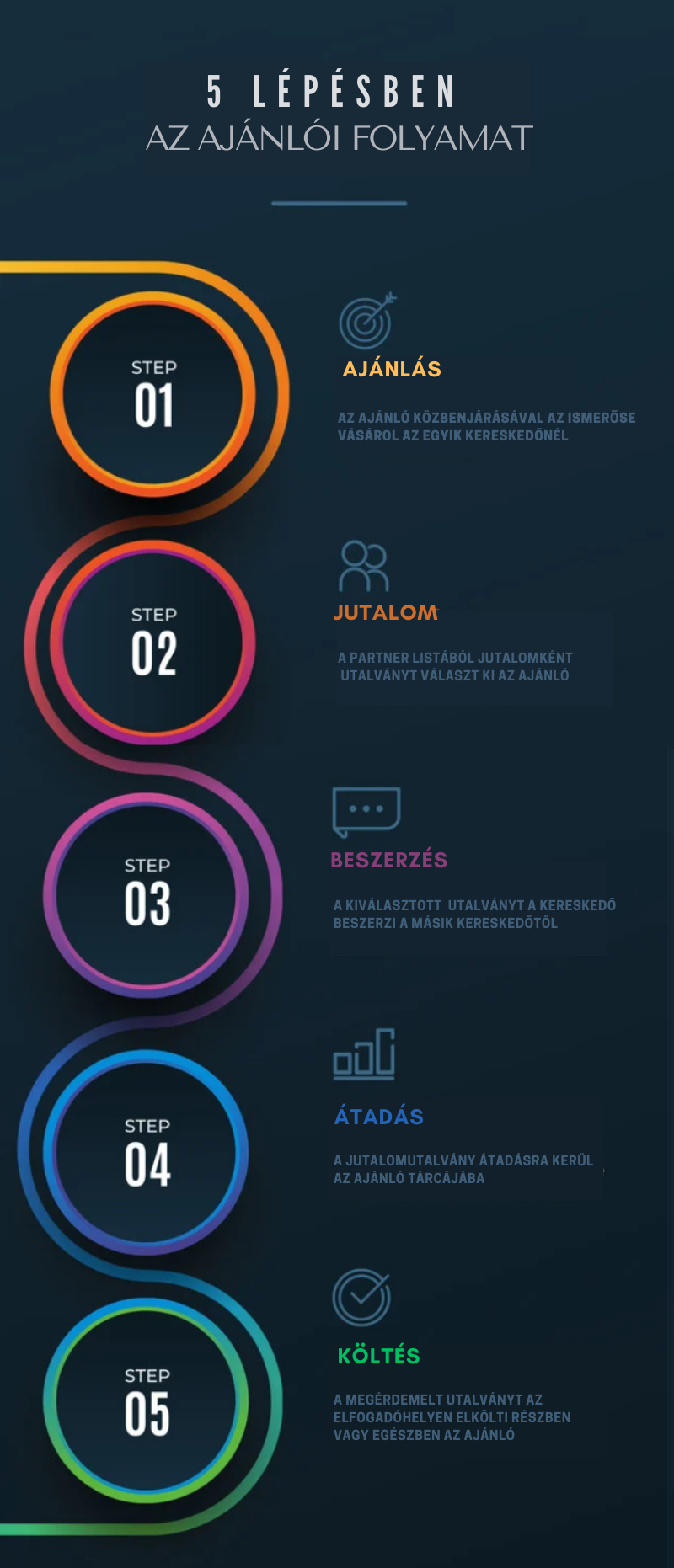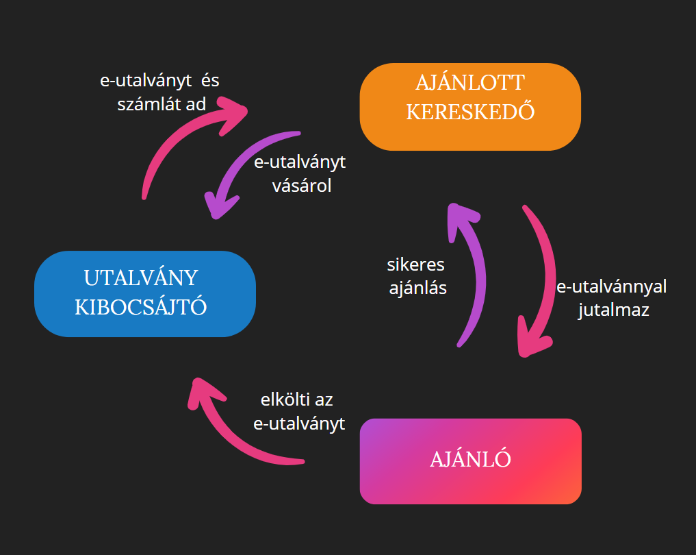 Hirdethető, nem kell számlaképesnek lenni az ajánlónak. Ha az ajánló az ismerősét a Te boltodba, szalonodba, éttermedbe küldi be vásárolni, azzal tudod motiválni, hogy vagy a saját utalványod vagy másik kereskedőtől vásárolt utalványt kínálod fel számára vásárlás mértékéhez képest. Ez teljesítmény alapú, csak a megtörtént vásárlás után történik jutalmazás. Teljesen egyedi, adott szektorban kizárólag egy kereskedő tud ezzel élni régiónként!